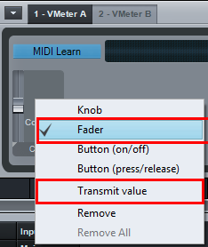 - Right click again and select "Transmit value". This will enable Studio One to display automation on the VMeter's LEDs.